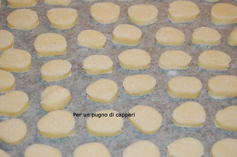 Mettere nella carta da forno e far riposare in frigo per mezz’ora, quindi tagliare i salamini in fettine di circa 3-4 millimetri, passare i diamantini nello zucchero, sistemare sulla teglia coperta con carta da forno e cuocere a 180° per 10-12 minuti.