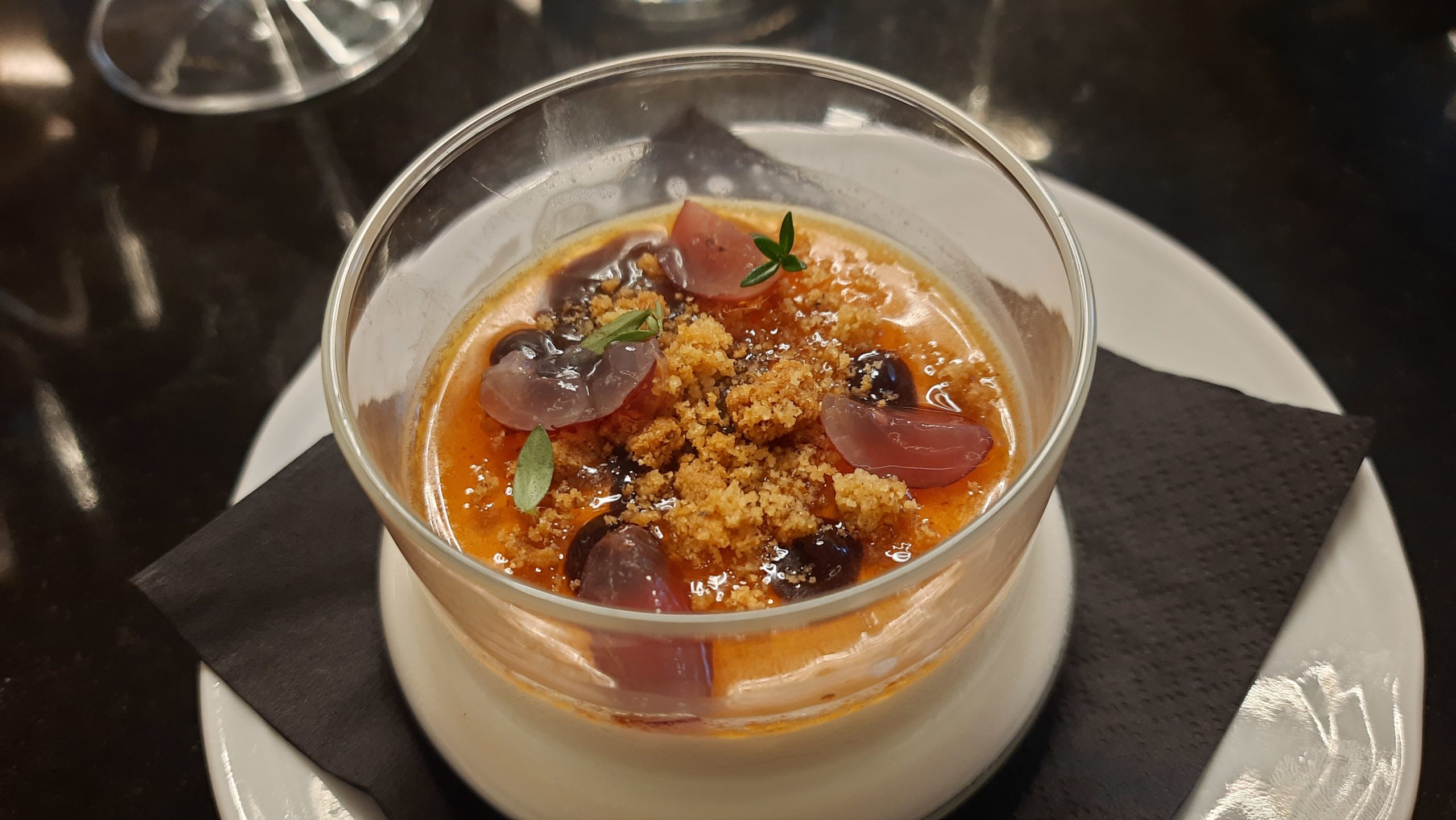 La brace resta l’elemento che contraddistingue e valorizza ogni creazione di Dogma: Gabriele ne fa un uso sapiente e cadenzato, che permette di impreziosire ogni piatto conservandone la leggibilità gustativa. Lo si può notare nella Pasta alla brace con pesce del giorno, Topinambur e Aceto Balsamico, dei bottoncini ripieni di merluzzo affumicato con fondo di pesce, topinambur croccante e aceto balsamico, con il Guanciale di Pesce e Zucca alla brace, accompagnato da una cialda croccante ripiena di funghi lavorati come un paté e funghi alla brace, e anche nel dessert, una deliziosa Panna cotta affumicata, miele di Maccarese e frutta di stagione (uva rossa nel nostro caso), con il lieve sentore di affumicato che sorprende piacevolmente il palato. Un’esperienza di assoluto rilievo arricchita da un servizio di sala sempre attento e cortese, e dagli abbinamenti con i vini: Ninì, Vermentino Toscana IGT dell’Azienda Agricola I Cavallini e Sonnrain 2019, Thomas Niedermayr, Hof Gandberg.