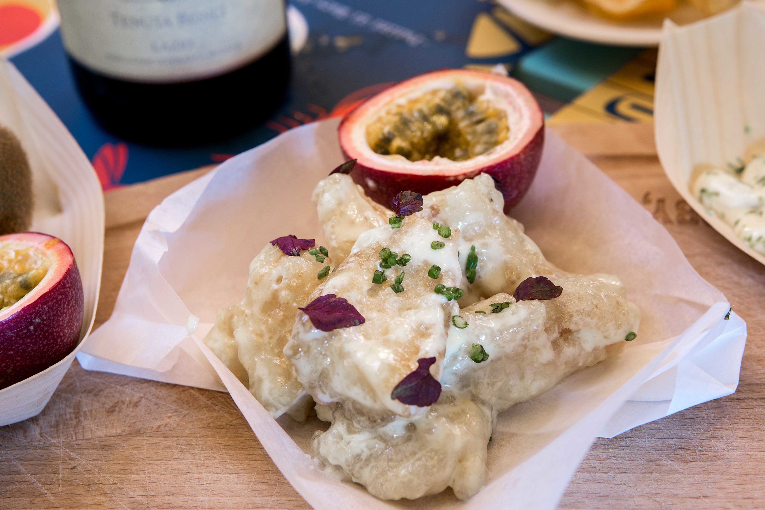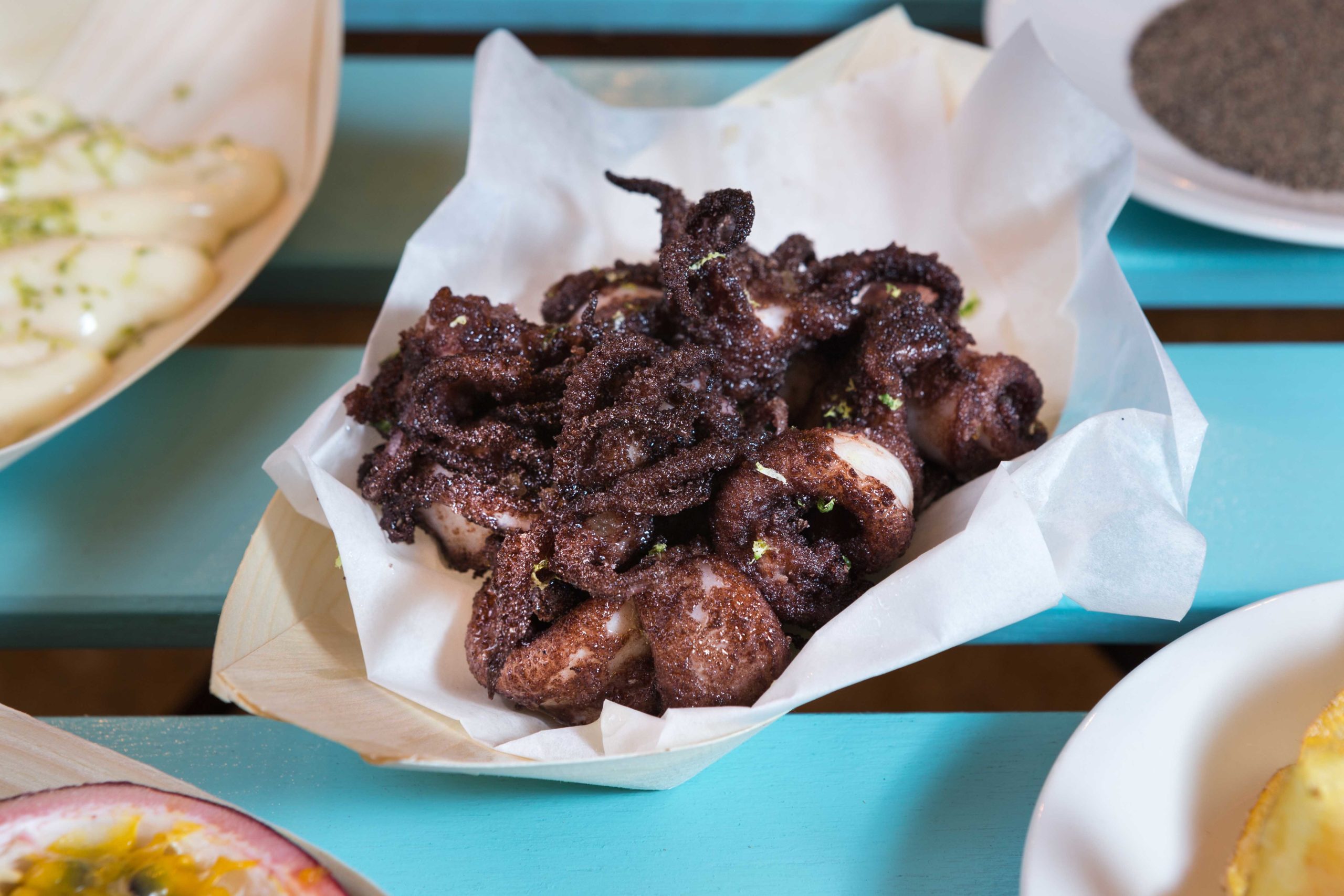 Andiamo a ritroso, partendo dal beverage: è possibile scegliere tra alcuni birre (commerciali), una serie di etichette di vini principalmente laziali con un paio di referenze naturali, oltre naturalmente ad acqua e bibite in lattina. Un’offerta essenziale ma che trovo in linea che lo stile del locale ed il concept gastronomico. Il pranzo inizia con un assaggio di due fritti: il Frito de Lula al cacao, ovvero frittura di calamari al cacao, evidenza la bontà della materia prima, una buona cottura e la presenza dell’inusuale ingrediente che non stravolge il gusto ma lo rende piacevolmente intrigante; a seguire il Frito de Pescatrice e Maracuja (bocconcini di rana pescatrice con glassa al wasabi, mango e frutto della passione), un abbinamento esotico che mette in luce l’ottima cottura del pesce, ancora umido all’interno, ed il particolare mix di sapori che incuriosisce il palato.