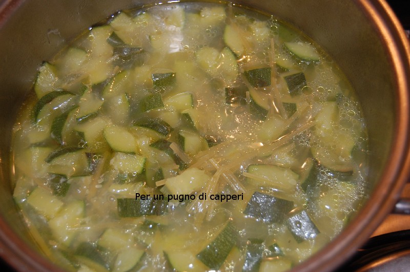 Cuocere fino a quando le zucchine risulteranno morbide, ma non sfatte. Aggiungere gli spaghetti spezzati, il sale, e proseguire a fiamma media, seguendo il tempo di cottura della pasta.