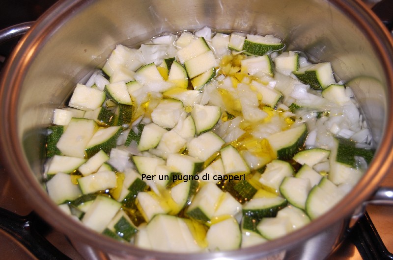 Lavare le zucchine e tagliarle a dadini non troppo piccoli. Tritare la cipolla e metterla in un tegame con le zucchine, un filo d’olio d’oliva ed il basilico. Aggiungere acqua fredda fino a coprire le zucchine, quindi mettere il tegame sul fuoco, a fiamma bassa.