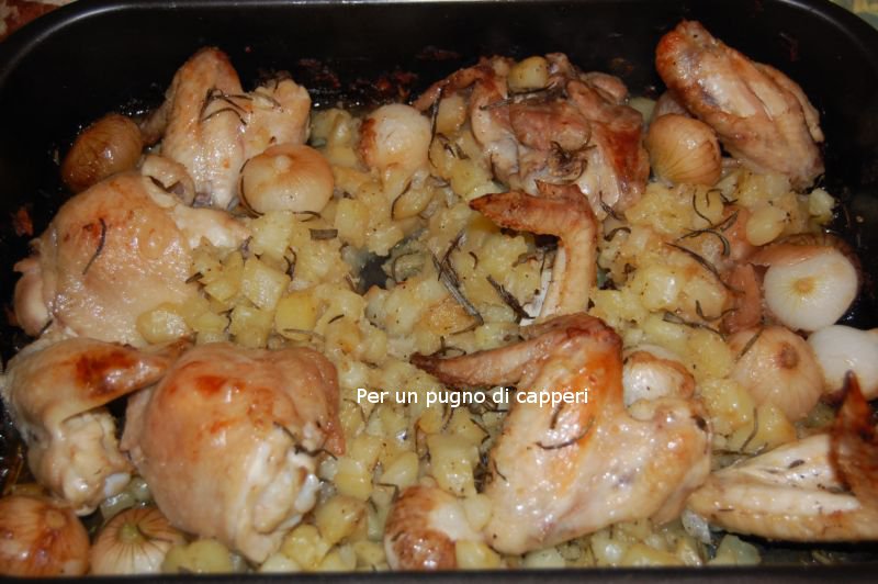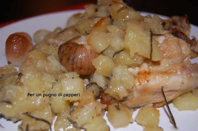 Tagliare le patate a pezzetti, e metterle in una teglia con olio evo e sale grosso. Mettere in forno a 200° ed iniziare la cottura.