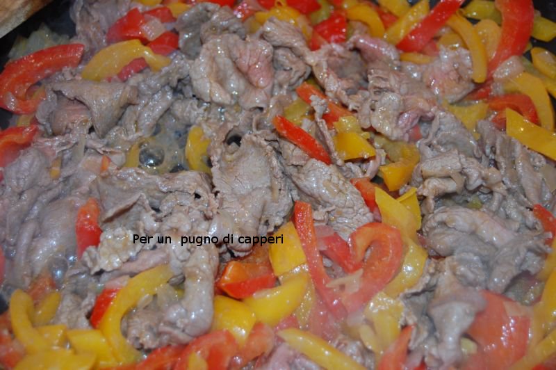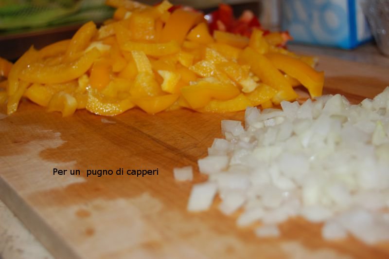Mettere in una padella l’olio evo e la cipolla tritata finemente. Quando la cipolla risulterà imbiondita, aggiungere i peperoni (precedentemente lavati in acqua fredda e tagliati a listarelle).