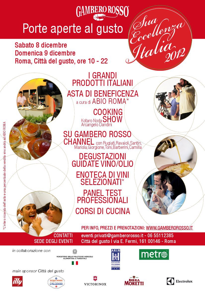 “Il progetto Sua Eccellenza Italia, nato lo scorso anno in ricorrenza dei 25 anni di Gambero Rosso con la presentazione di un Albo d’Oro che racchiude il meglio del food&wine italiano, quest’anno continua la sua “missione” nel valorizzare e promuovere l’Eccellenza Italiana nel mondo.” – Ha dichiarato il Presidente di Gambero Rosso Paolo Cuccia. – “ Proprio per questo, oltre a premiare chi si è distinto nel 2012, vogliamo far conoscere al pubblico, con un grande evento l’8 e il 9 dicembre, alcuni dei testimoni di quell’Italia eccellente che ha fatto del settore enogastronomico il miglior biglietto da visita del nostro Paese.”