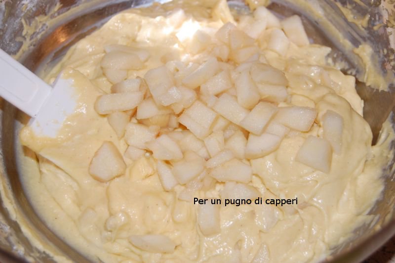 L’impasto risulterà diverso da quello solito che si ottiene per preparare un dolce. Avrà una certa consistenza ed elasticità, che permetteranno ai pezzetti di pera di non scendere tutti sul fondo della torta. Sbucciare le pere e tagliarle in piccoli pezzi, aggiungerli all’impasto.
