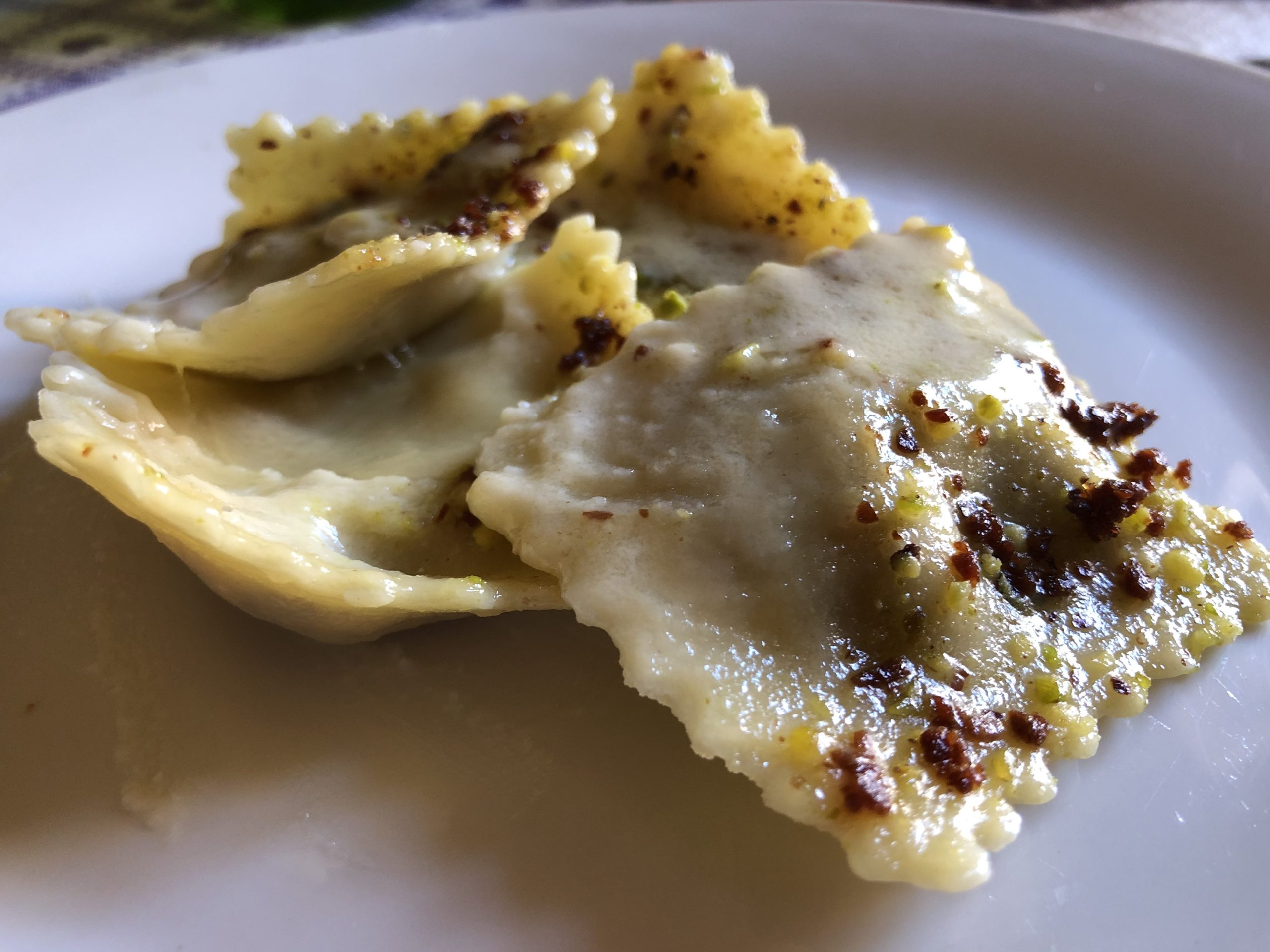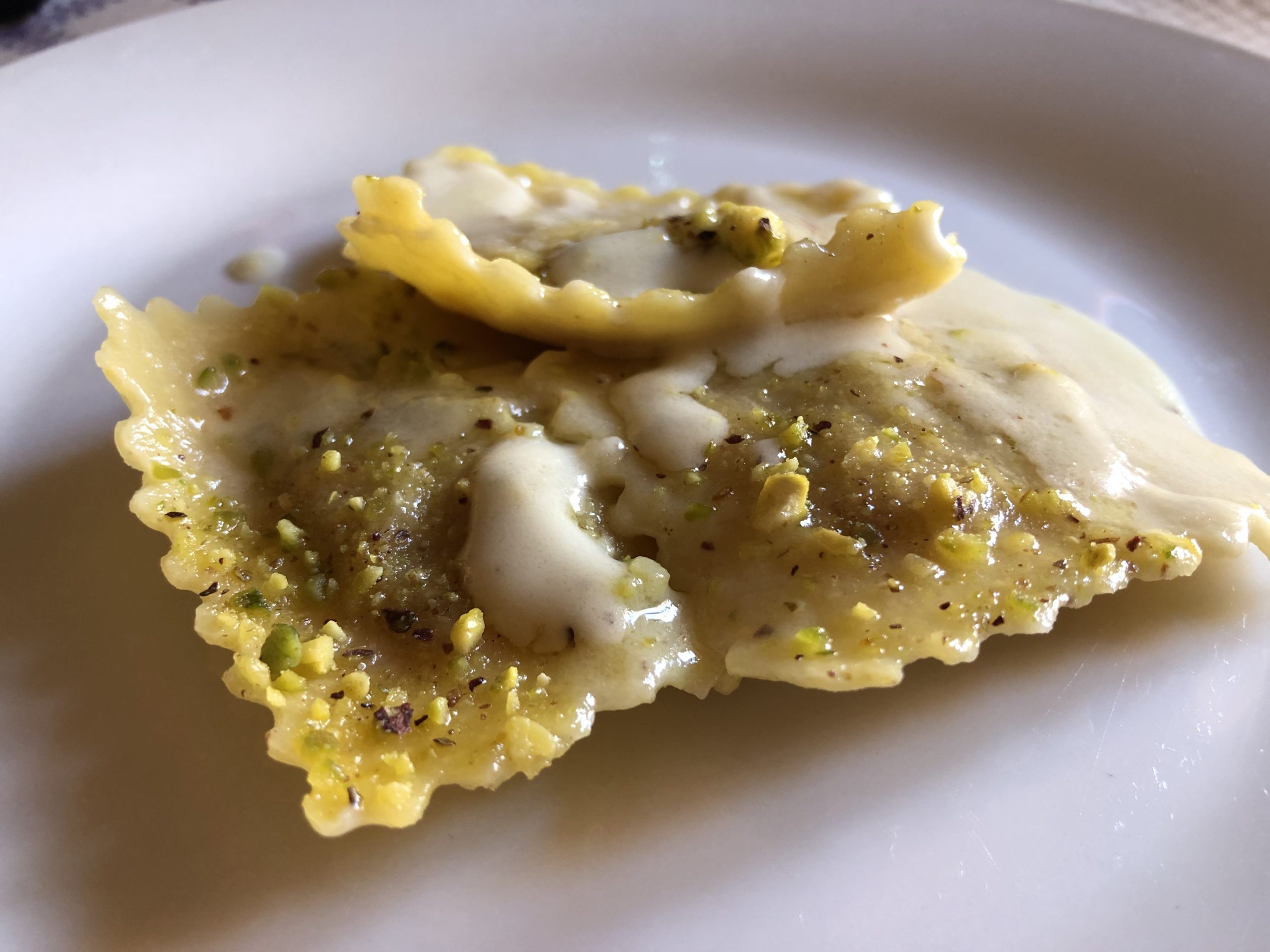 Si passa quindi ai primi iniziando con i Tortelli di Zucca mantecati con fonduta di reggiano e crumble di pistacchio. La cottura e lo spessore della pasta sono giusti, il sapore nel suo complesso piuttosto dolce ma comunque piacevoli al palato. L’altra versione con Porcini mantecati con fonduta di reggiano, crumble di pistacchio e parma è veramente molto buona grazie all’intensità del sapore del ripieno e al divertente contrasto con la croccantezza del prosciutto.